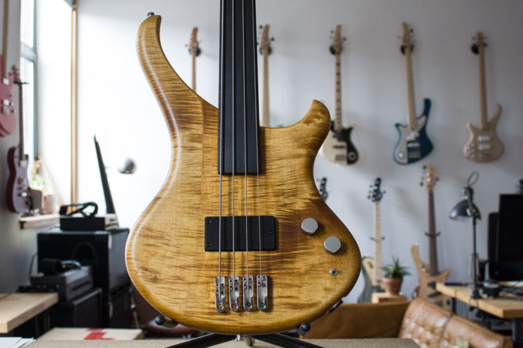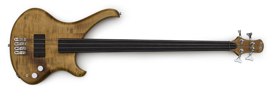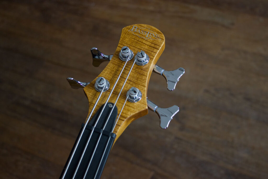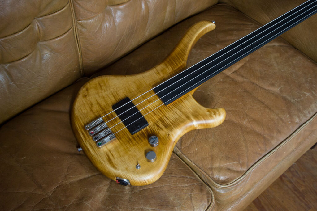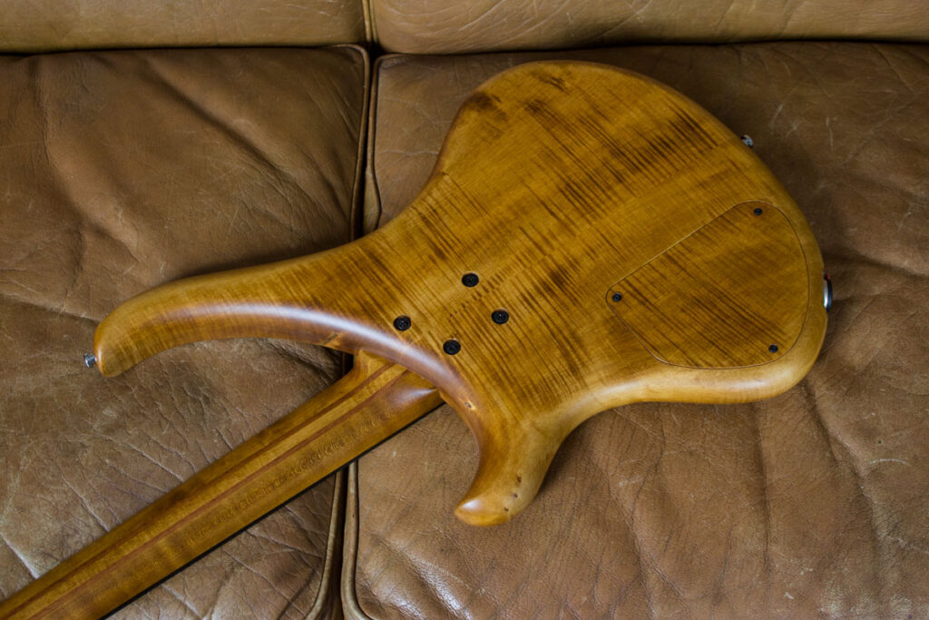 Unsere Fretless-Busters müssen nicht immer mit einer aufgeleimten schmückenden Decke ausgestattet sein. Das geht dann auch mit einem massiven Body und hört dann auf den Namen Buster Standard. In dem Fall ist es ein schön geflammter Ahorn, den wir in einer Art „vintage amber“ getönt haben. Den Fünfstreifigen Hals haben wir direkt mit gebeizt, damit es wie aus einem Guss daherkommt. Der ganze Bass ist passiv – kommt also nur mit zwei Knöpfen aus: Volume und Tone. Und natürlich dem Minischwitch um den Häussel Jazzbucker unterschiedlich schalten können. Ausnahmsweise dieses Mal mit Chrom-Hardware und Singlebridges, die den Bass trotz seiner Einfachheit sehr edel wirken lassen.