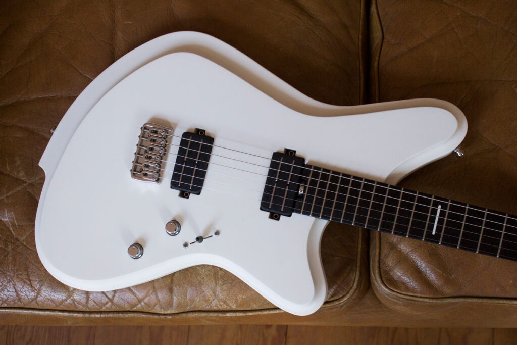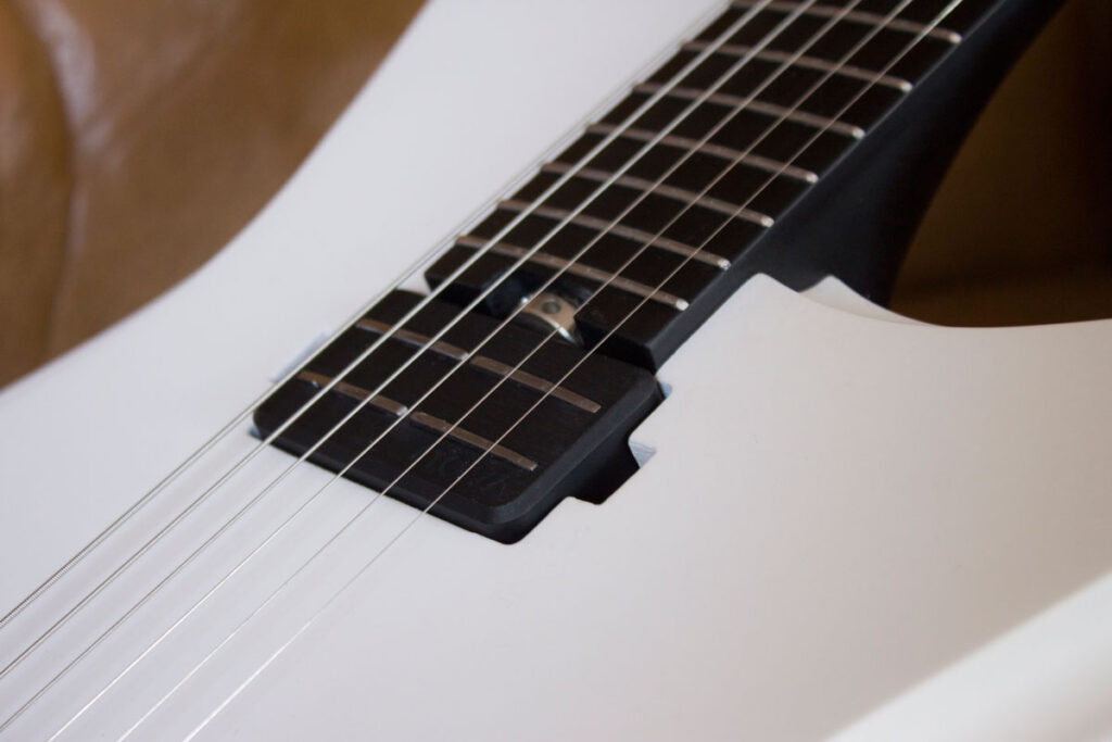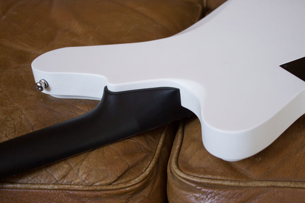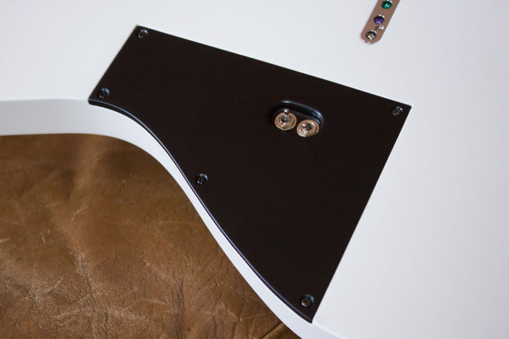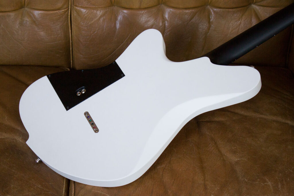 Sie ist kontraststark zweifarbig konzipiert und aktiv. Eben komplett anders, obwohl die Bauart und die Holzauswahl komplett gleich zur roten ist. Hier haben wir alles, was aus Ahorn gefertig ist, schwarz eingefärbt. Dazu gehört auch die Backplate, in der wir zwei Miniswitches eingelassen haben um die vierspuligen Nova Omnia Rail-Pickups switchen zu können.