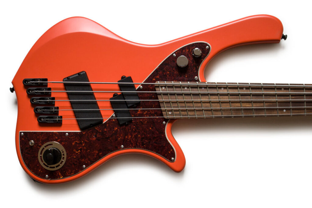 Our re:belle series are also available with a 34″-36″ multiscale. We changed the bodyshape a little bit and designded this aggressive-looking spike to find a slot for the ETS single bridges that make a 914,4mm scale on the low B-string possible. Compared to the more traditional sounding häussel pickups, which we use on the standard models, we choose custom Delano-pickups that provide full and precise sound even in deep bass frequency band. These pickups allow this kind of slanted position referring to the fanned frets and scale length.
