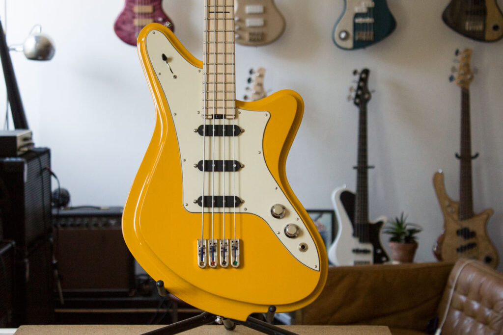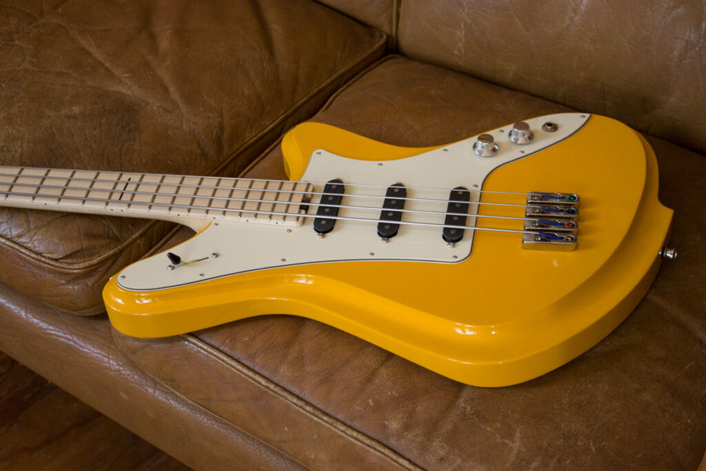 Es ist ein Bass in klassischer Gitarrenmanier mit drei Häussel-Singlecoils, 5-Wege-Schalter, Gilmour-Mod per push/Push Tonepoti, Roundwound-Saiten – und das alles in sonnig-glänzendem Narzissengelb. O-Ton: „Jetzt habe ich Lust auf Spiegelei“