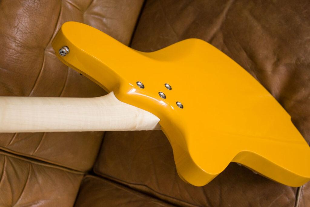 Die Farbgebung ist tatsächlich angelehnt an eine Johnny Marr Jaguar in Feverdream Yellow, die wir kürzlich zum Setup in der Werkstatt hatten. Die war so schön schräg drüber – das wollten wir auch. Und dann haben wir uns auch mal wieder an einer Hochglanzlackierung versucht.
