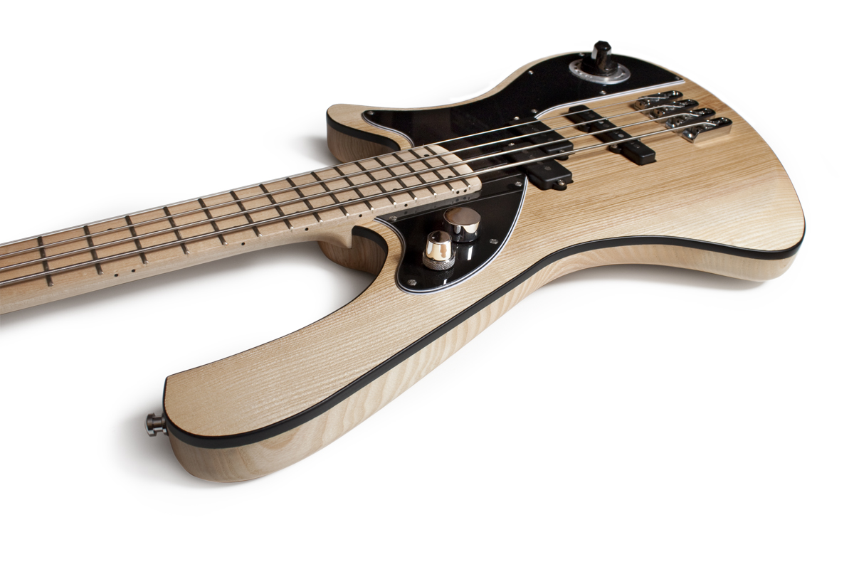 Unsere Instrumente der re:belle series sind nun neben den deckenden Standard-Farben auch als „natural ash“ Version erhältlich. Hier wird das offenporige Eschenholz matt versiegelt, sodass die Holzstruktur ertastbar bleibt. Eine weitere Neuerung ist der Einsatz eines Bindings an der Korpusvorderseite, was einen tollen Kontrast zum hellen Holz bildet. In diesem Fall haben wir ein schwarzes Binding passend zum schwarzen Pickguard und den schwarzen Pickupkappen gewählt, welches auch dem Kurvenverlauf des „Armrest-Shapings“ folgt und so dem Korpus eine sehr dreidimensionale Erscheinung gibt.